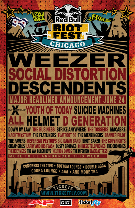 The Chicago line up includes the likes of Weezer, Social Distrotion, Descendents, X, Youth of Today, Suicide Machines, Helmet, The Menzingers, Cheap Girls, The Copyrights, Chinese Telephones and about a million other bands. Riot Fest 2011 will be taking place over the weekend of October 6 – 9 in Chicago and tickets will be going on sale Friday June 24 at 9 AM Central time.