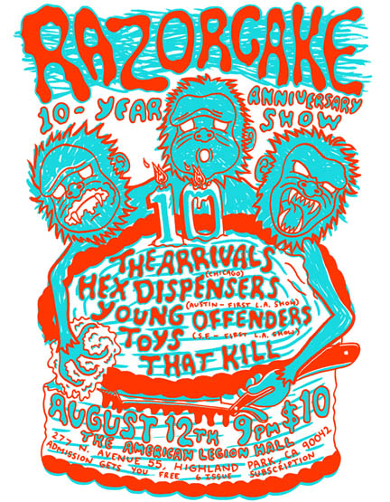 The not for profit magazine Razorcake is celebrating their 10th Anniversary on August 12th at the American Legion Hall in the Highland Park neighborhood of Los Angeles. This is promised to be a grand old time that will feature the Arrivals, Toys that Kill, Hex Dispensers and the Young Offenders.